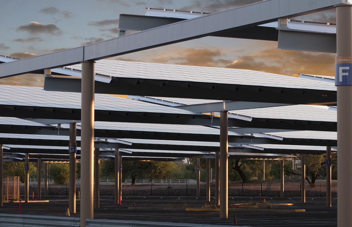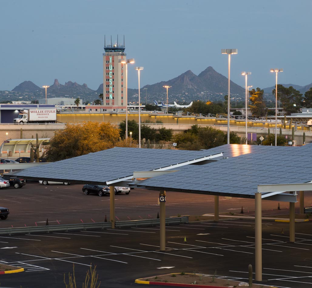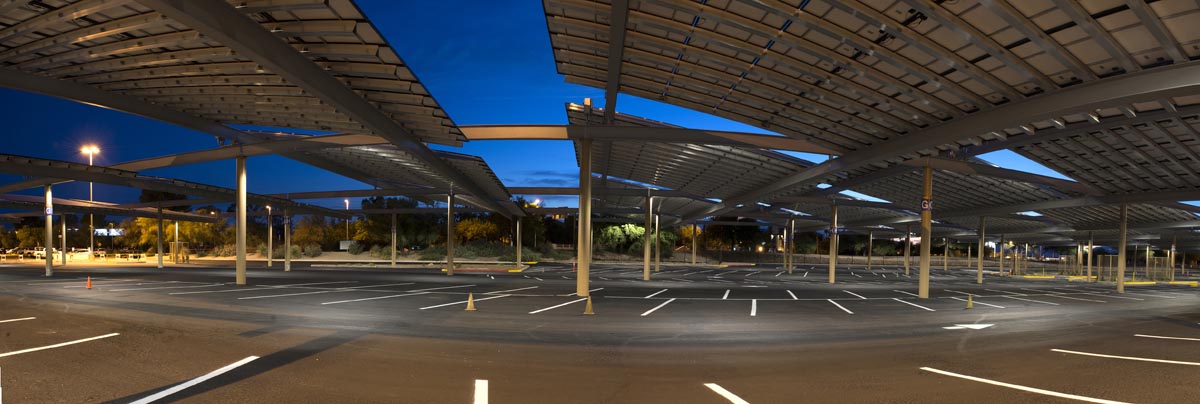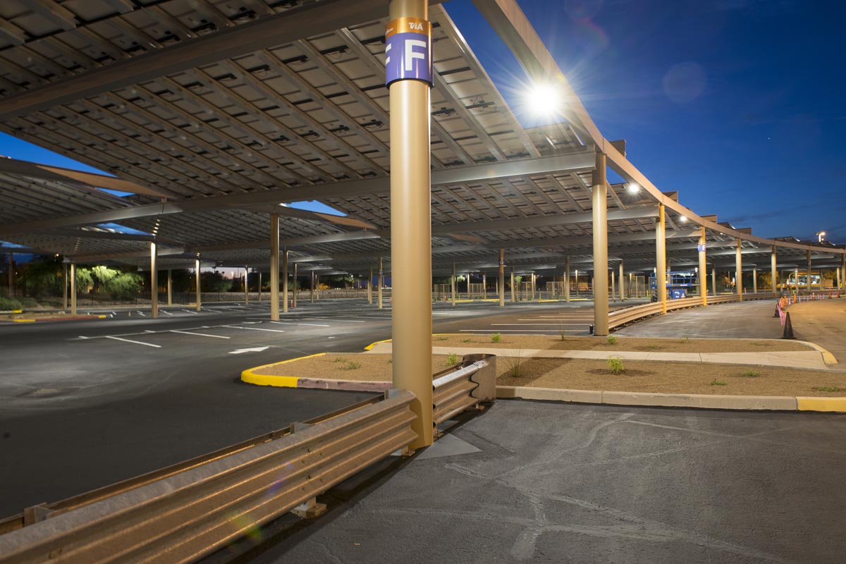 This project involved design and construction of the 1-megawatt photovoltaic, fixed-tilt array reaching 20 feet over the main hourly/daily public parking lot at the Tucson International Airport Terminal. The structure is a curved, open-lattice design with polycrystalline silicon panels arranged in strips with equal spacing. Vegetated “green walls” with live plants, in addition to the structure itself, create a cooling, microclimate effect in the parking area.