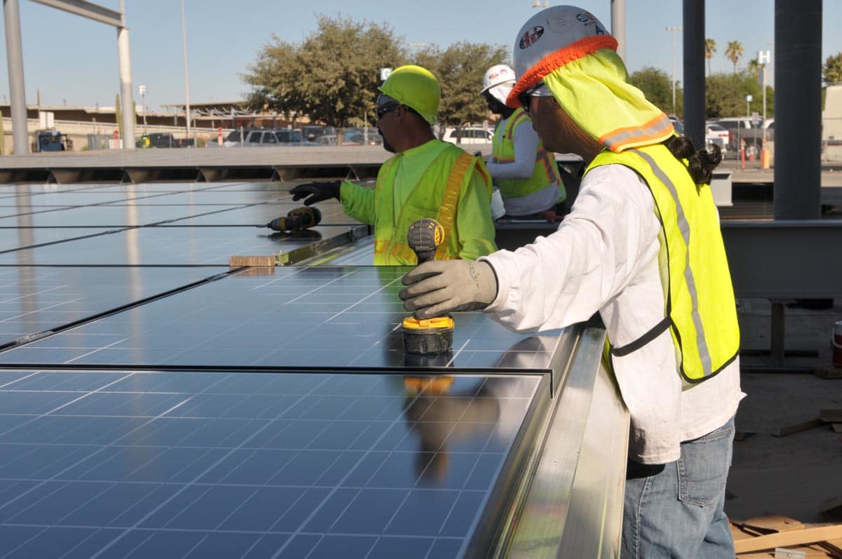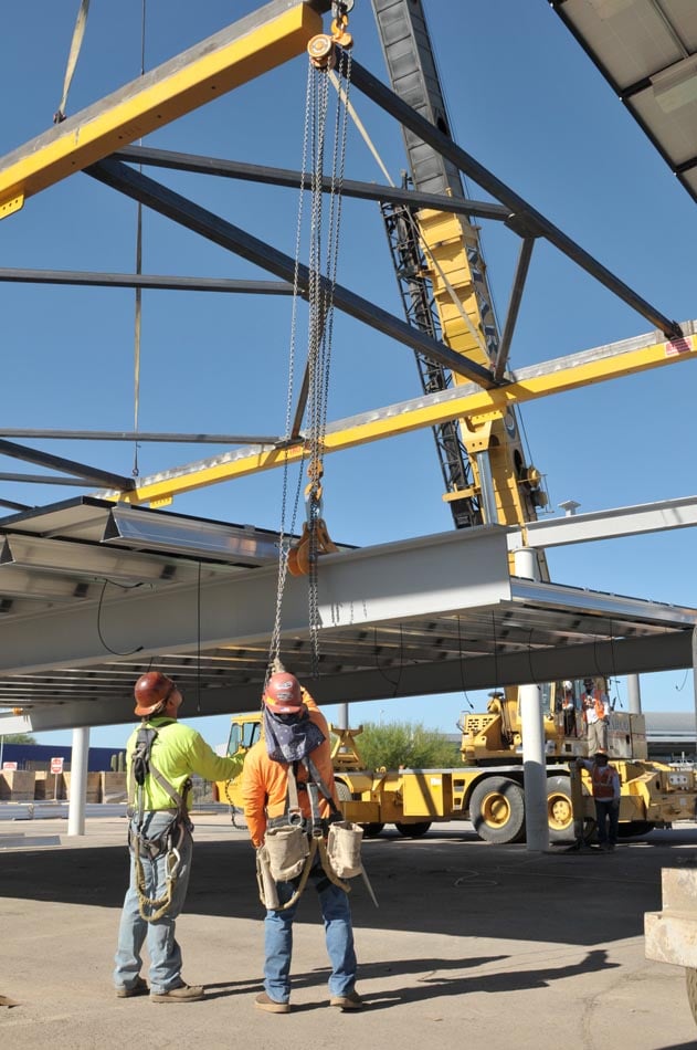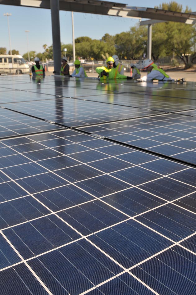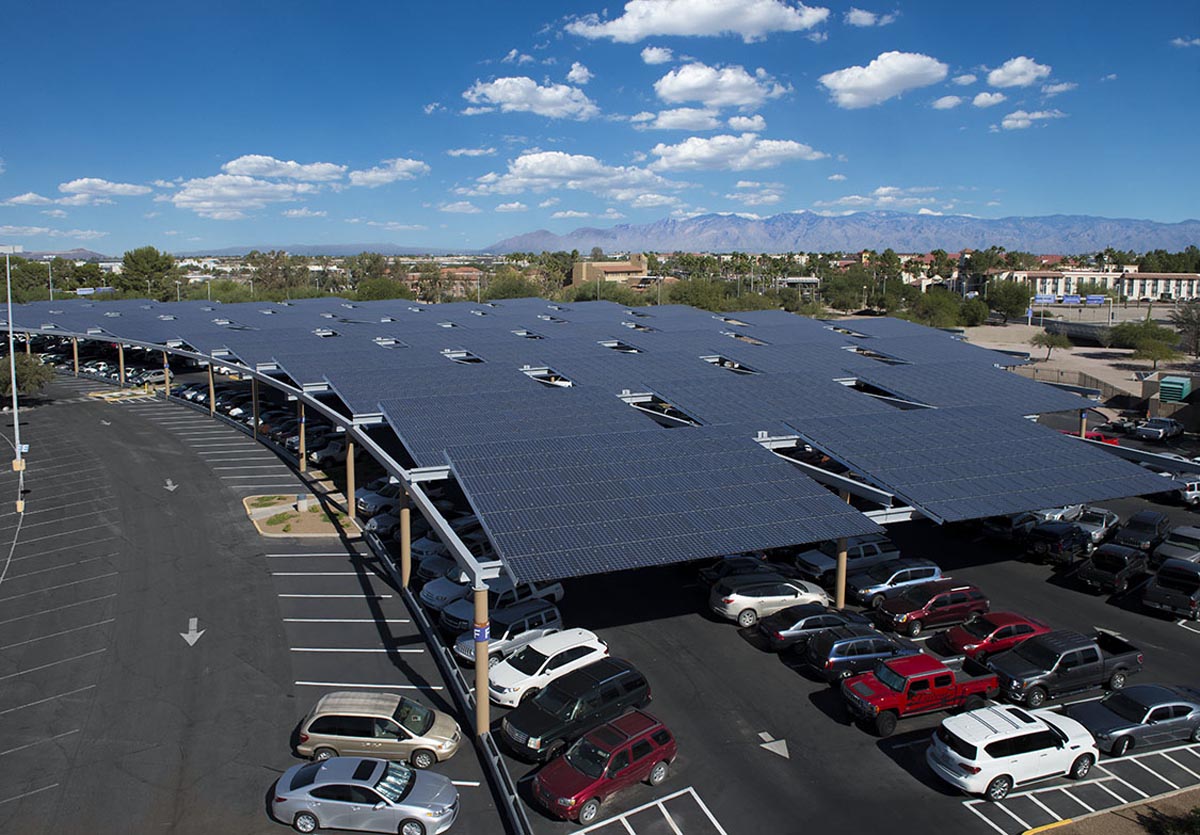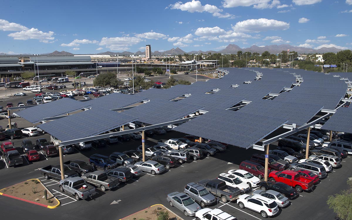 This project involved design and construction of the 1-megawatt photovoltaic, fixed-tilt array reaching 20 feet over the main hourly/daily public parking lot at the Tucson International Airport Terminal. The structure is a curved, open-lattice design with polycrystalline silicon panels arranged in strips with equal spacing. Vegetated “green walls” with live plants, in addition to the structure itself, create a cooling, microclimate effect in the parking area.